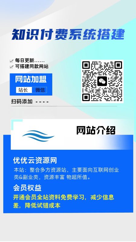 加盟优优云网创,加盟搭建同款知识付费资源网站,实现长期稳定被动收入~